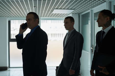 Serious successful entrepreneur and his two assistants coming to meeting