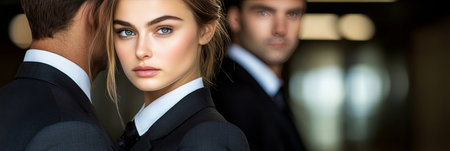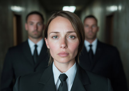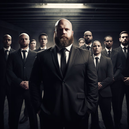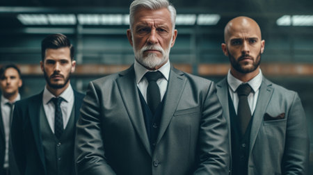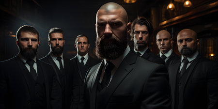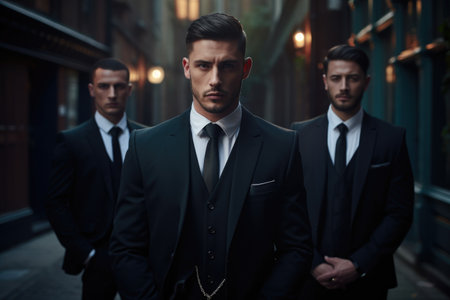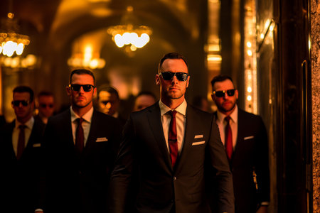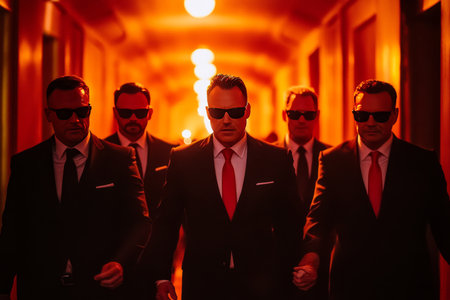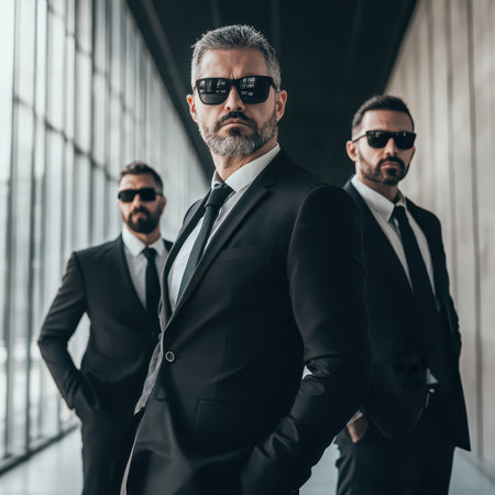 A team of professional bodyguards in formal attire looking vigilant. Concept Security Guard, Protection Services, Formal Attire, Professional Team, Vigilant Look