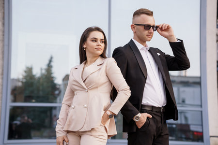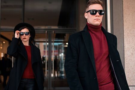 Young fashion business couple on city street Stylish man and woman in classic black coats and sunglasses