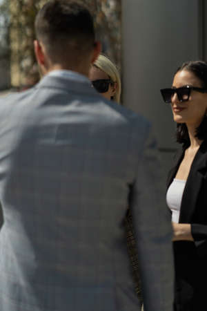 Three business people with sunglasses are on their break and they are talking