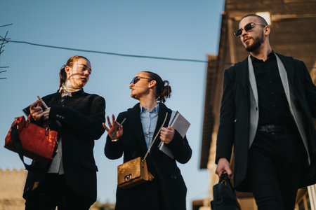 Young coworkers walk together in business attire, carrying bags and notebooks in an urban outing