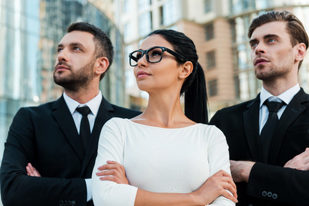 Large ambitions open new horizons. Low angle view of three confident business people keeping arms crossed and looking away while standing outdoors