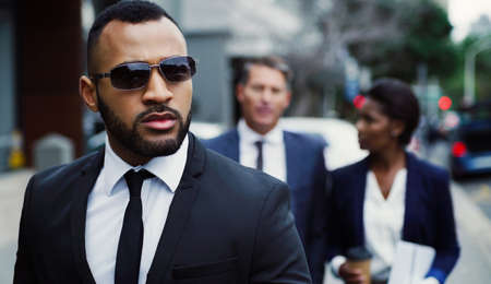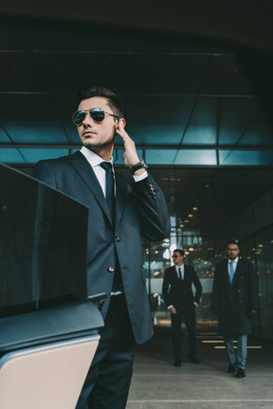 Celebrity bodyguard and VIP person security close protection services. Professional police agent special forces with sunglasses in civilian black suit