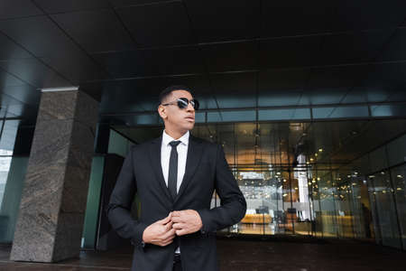 african american guard in black suit and dark sunglasses looking away near hotel building