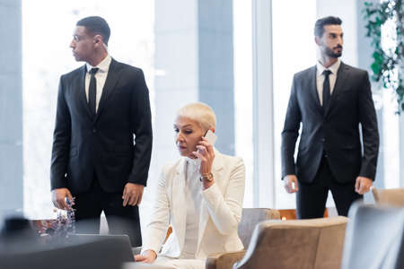 mature businesswoman calling on smartphone near laptop and interracial guards in hotel