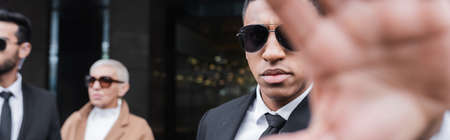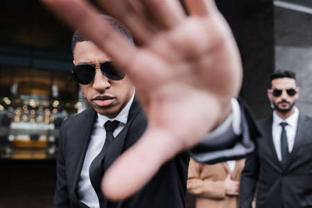 bi-racial guard in sunglasses showing stop gesture near businesswoman and african american security man on background