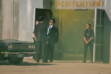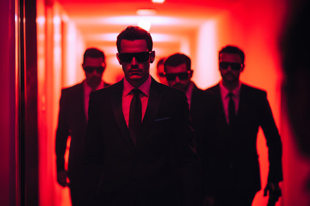 Confidently walking suited men in sunglasses through a dimly lit corridor at an evening event
