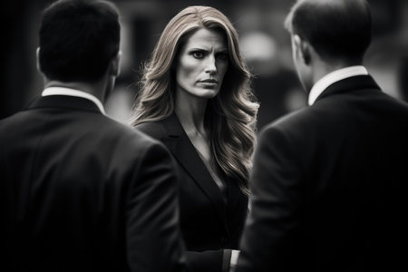 Business people collaborate in a sleek office building, displaying determination and professionalism while discussing important matters in a dynamic atmosphere.