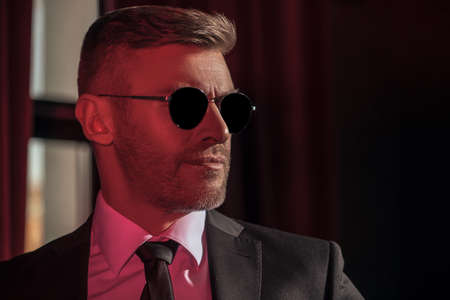 A portrait of a handsome mature man in a formal costume posing in the classic interior in red light. Men's beauty, fashion.
