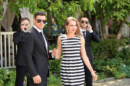 Young celebrity with bodyguards outdoors