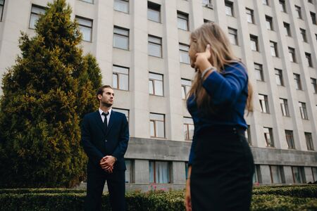 serious businessman in blue suit and man talking on phone