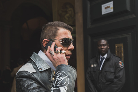 MILAN, ITALY - JANUARY 18: People gather outside John Richmond fashion show building for Milan Men's Fashion Week on JANUARY 18, 2015 in Milan.