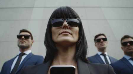 Confident businesswoman in sunglasses leading a group of stylish men in suits, embodying power and authority in a modern urban setting