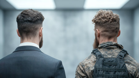 two men with different hairstyles and attire