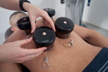 Masseur in cabinet massaging belly of bare woman lying down on couch with chinese jar. Specialist reception, professional massage and relaxation in spa salon. Healthcare and anticellulite treatment