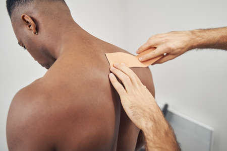 Close up of rehabilitation therapist putting physio tape on back of young woman to relieve muscle pain, copy space