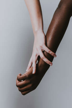 Black and white hands put together on white background . International friendship and business, unity, togetherness , race equality, help concept.