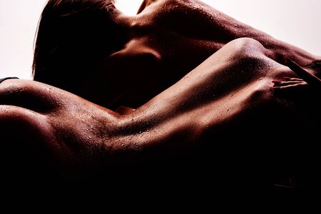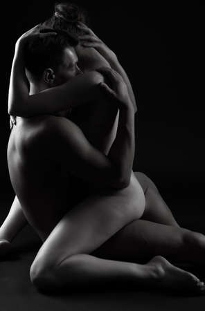 Sexy couple nude slim athletic man and erotic slender lady naked touching bodies in the dark.
