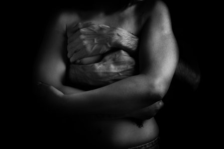 Woman's hands holding big breasts close up. Photo of a woman in shadow.