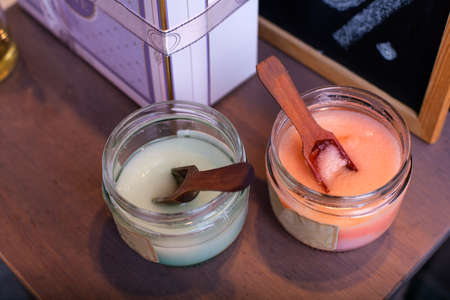 Natural ingredients body scrab in the jars. Skin care, spa and clean cosmetic concept. Health and beauty. Sea salt