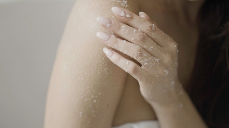 Bodycare concept, woman applying scrub on her body. Action. Sugar scrubbing of her shoulder and arm.