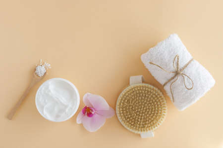 Body or face care concept. Beauty treatments at home or in the salon. Cream, sea salt, bath towel and eco body brush. Place for text