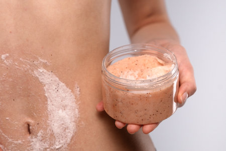 Young woman applying body scrub against gray background