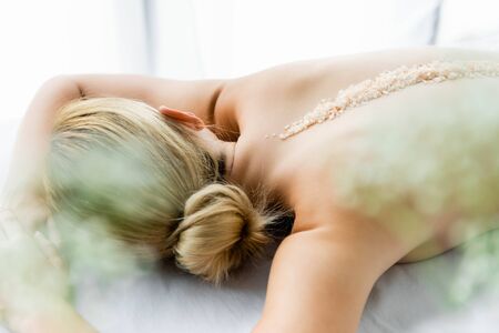 Top view of masseur smearing salt on back of woman