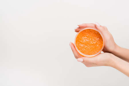 partial view of woman holding container with scrub in hands isolated on white