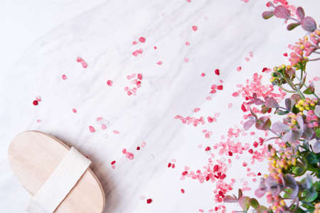 Wooden scrub brush, scented salt grain and herbs on the marble table. Spa salon banners and backgrounds