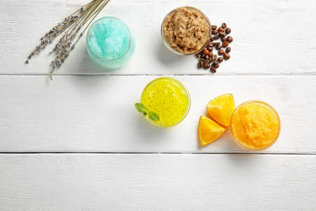Different body scrubs on white wooden background