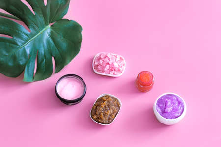 Spa composition with body care items on a colored background with a Monstera leaf. Spa concept.