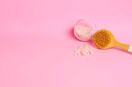 Sea salt in a glass glass and a wooden brush for dry massage on a pink background. Body care concept. Copy space, place for text. Close-up