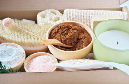home spa kit. relaxing scented candle, body scrub ingredients and natural luffa skin peeling cloth. body brush for dry massage. gift set in biodegradable cardboard box. eco present for her.
