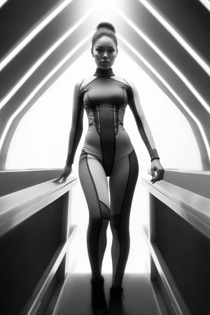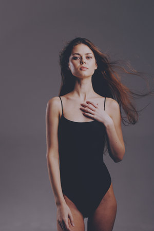 young woman in black bodysuit with long flowing hair stands confidently against gray backdrop with soft shadows, expressing strength and grace in modern fashion style