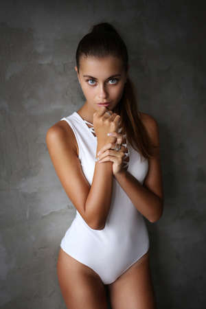 Beautiful young female brunette model in swimsuit