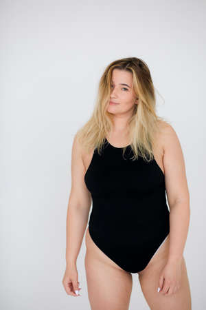 Beautiful overweight woman in black swimsuit on white background