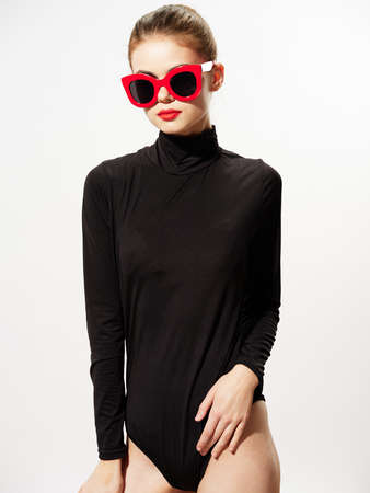Girl in a Black Bodysuit on a White Background. Girl with closed eyes. Concept Photo without retouching.
