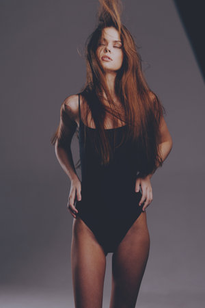 Young woman in black swimsuit posing confidently with wind-blown hair on gray background