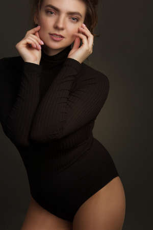 Elegant chic female model. Women in erotic underwear. Close-up portrait of a beautiful charming young attractive lady. Perfect girl body. Advertising and commercial design.