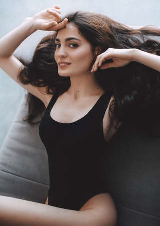 Studio portrait of young attractive woman model with redhead long curly hair, in bodysuit, standing near the sofa. Home comfort posing in lingerie