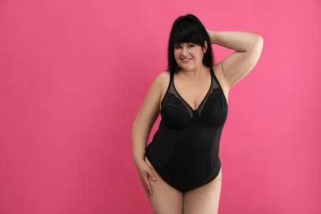 Beautiful overweight woman in black underwear on pink background, space for text. Plus-size model