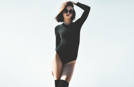 skincare. confident fashion model. makeup cosmetics. pretty girl with sexy look. girl with perfect face skin. Trendy makeup. sexy woman in bodysuit. Sport and fitness. fashion beauty. style beauty