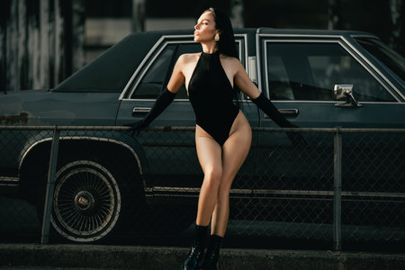 Fashion model. Street Fashion model walking near retro car outdoor. Glamour woman in trendy fashion bodysuit. Beauty trends. Girl. Perfect fashionable lady. Fashion. Charisma stylish woman.