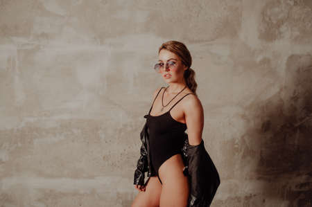 Rock concept. Portrait of charming blond woman in black bodysuit and leather jacket. Pink sunglasses.