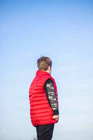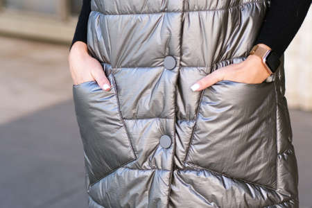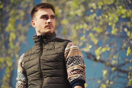 Man in jacket on sunny natural background. Close up of body in jacket outdoors. Nice travel concept.