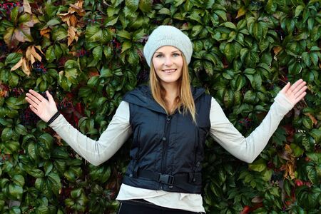 Girl in autumn style. Teen girl wear vest and sweater. Autumn fashion girl. Trendy and stylish teenager girl smiling. Fall fashion style for teen. Outfit for fall style. Autumn trend. Cozy sweaters