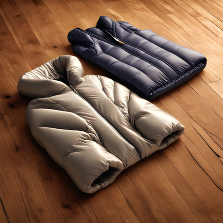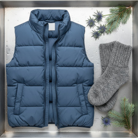 Warm blue puffer vest and cozy gray wool socks laid out with pine branches for winter clothing and seasonal outdoor comfort.