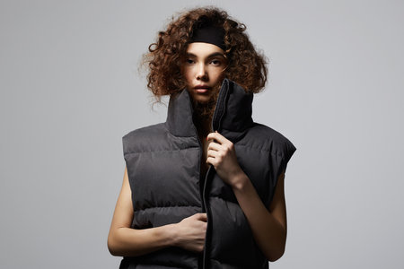 fashion portrait of beautiful young woman in stylish vest. pretty curly hairstyle girl