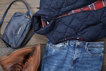 layout fashionable clothes and accessories from the top view, on a wooden board